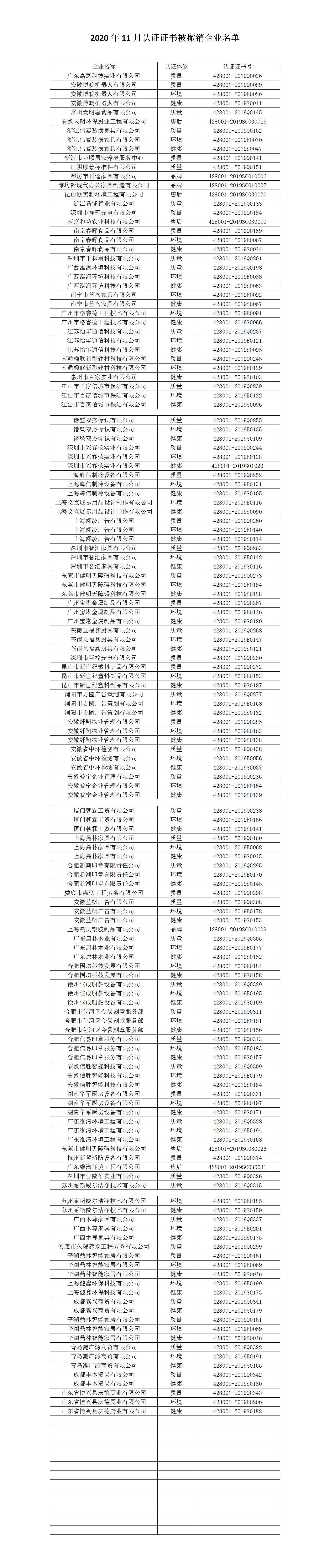 2020年11月認證證書被撤銷的企業名單...